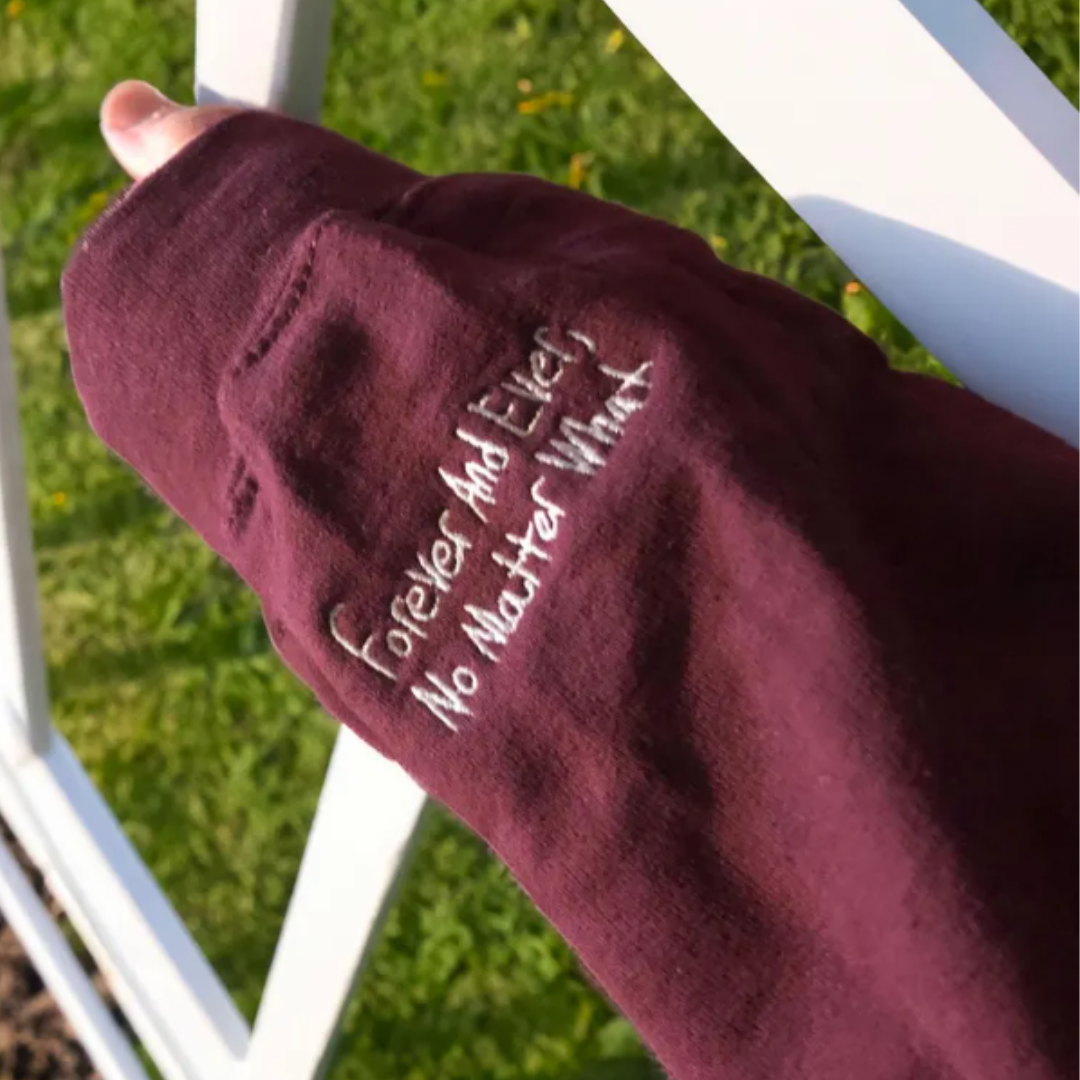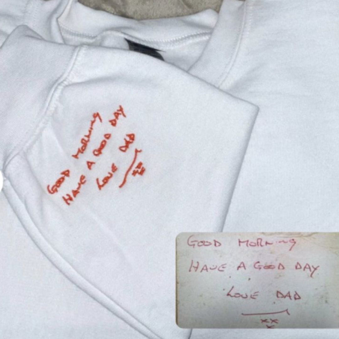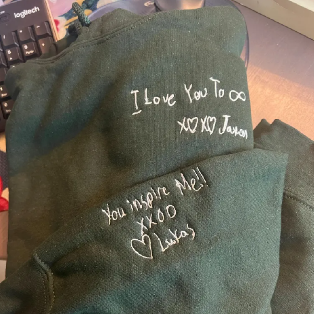 Pulover z napisom, ki je napisan točno tako, kot je bil prvič — z roko tistega, ki ti največ pomeni.